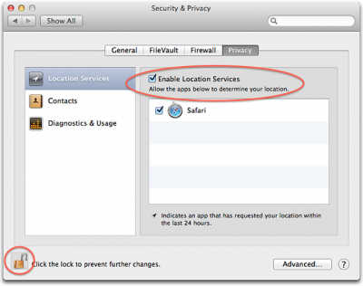 Follow these steps to enable location services in OS X Mountain Lion or later